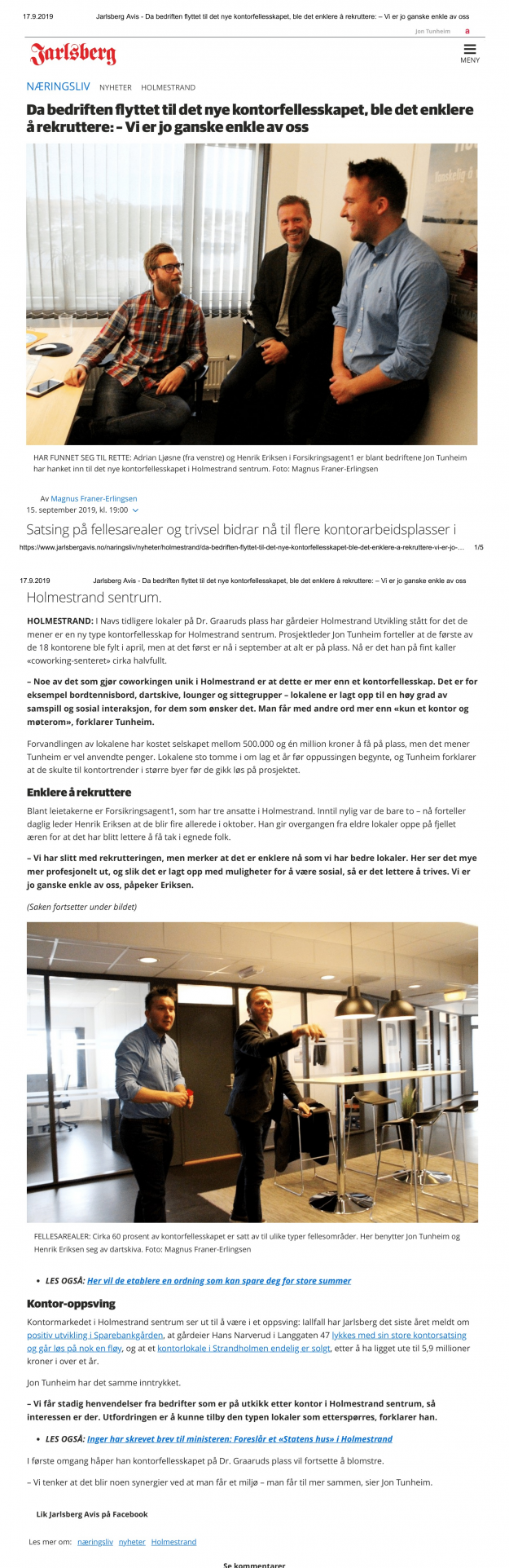 Satsing på fellesarealer og trivsel bidrar nå til flere kontorarbeidsplasser i Holmestrand sentrum.